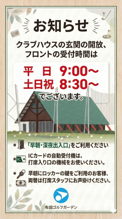 クラブハウス開放時間のお知らせ 2026/03/09 平素より福岡市早良区の有田ゴルフガーデンをご利用いただき、 誠にありがとうございます。 クラブハウス玄関の開放およびフロント受付時間を下記の通りと させていただいております。 皆さまのご理解とご協力をお願い申し上げます。