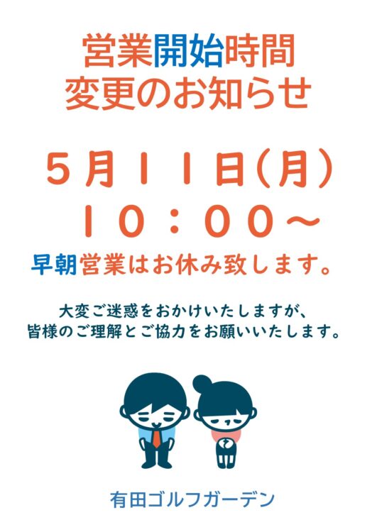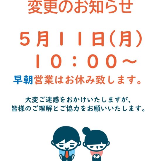 5月11日(月)営業開始時間変更のお知らせ