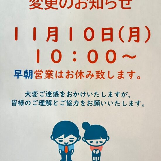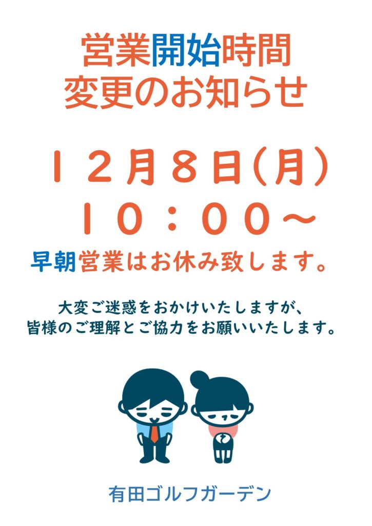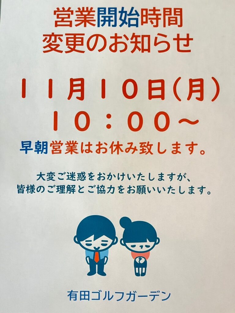 202511/06 ★11月10日(月)営業開始時間変更のお知らせ★ 11月10日(月)営業開始時間変更のお知らせ 2025年11月10日(月)の有田ゴルフガーデン早朝営業はお休みさせていただき、営業開始時刻は午前10:00~となります。 大変ご迷惑をお掛け… 続きを読む