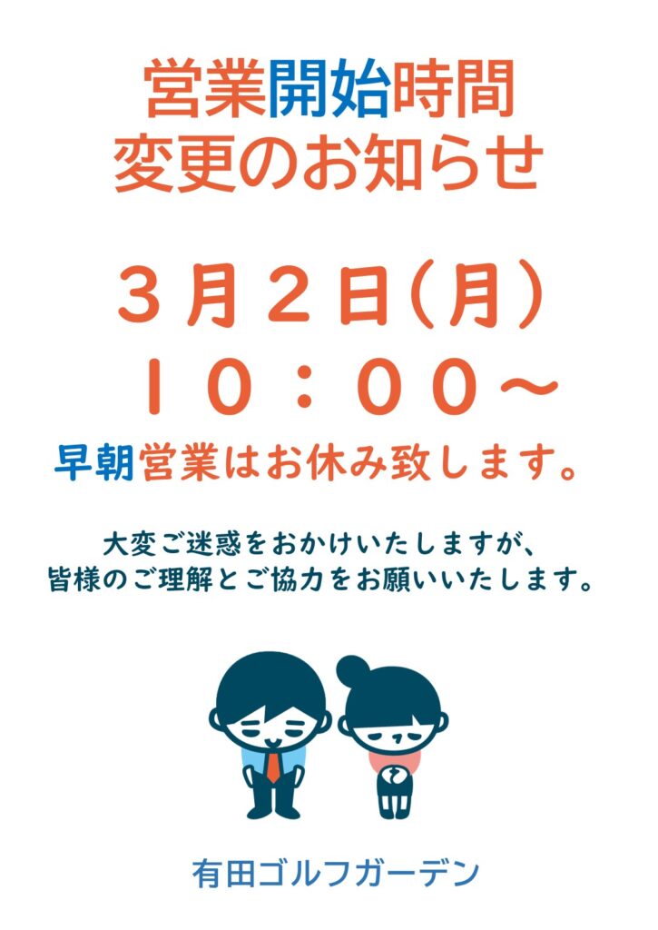 202602/11 3月2日(月)営業時間変更のお知らせ 平素より有田ゴルフガーデンをご利用いただき、誠にありがとうございます。 3月2日(月)は場内整備のため、営業開始時間は10:00となり、 早朝営業はお休みさせていただきます。 ご迷惑をおかけしま… 続きを読む