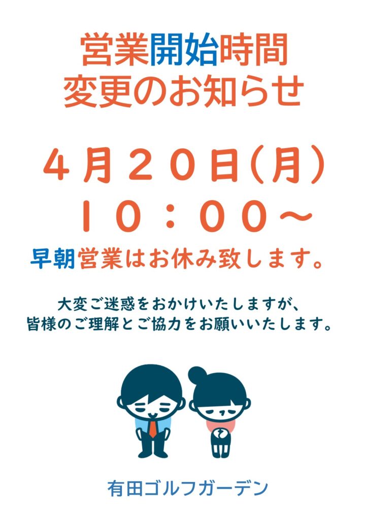 202604/03 4月20日(月)営業開始時間変更のお知らせ 平素より福岡市早良区の有田ゴルフガーデンをご利用いただき、 誠にありがとうございます。 4月20日(月)は場内メンテナンスのため、 営業開始時間は10:00で、早朝営業はお休みさせていただき… 続きを読む